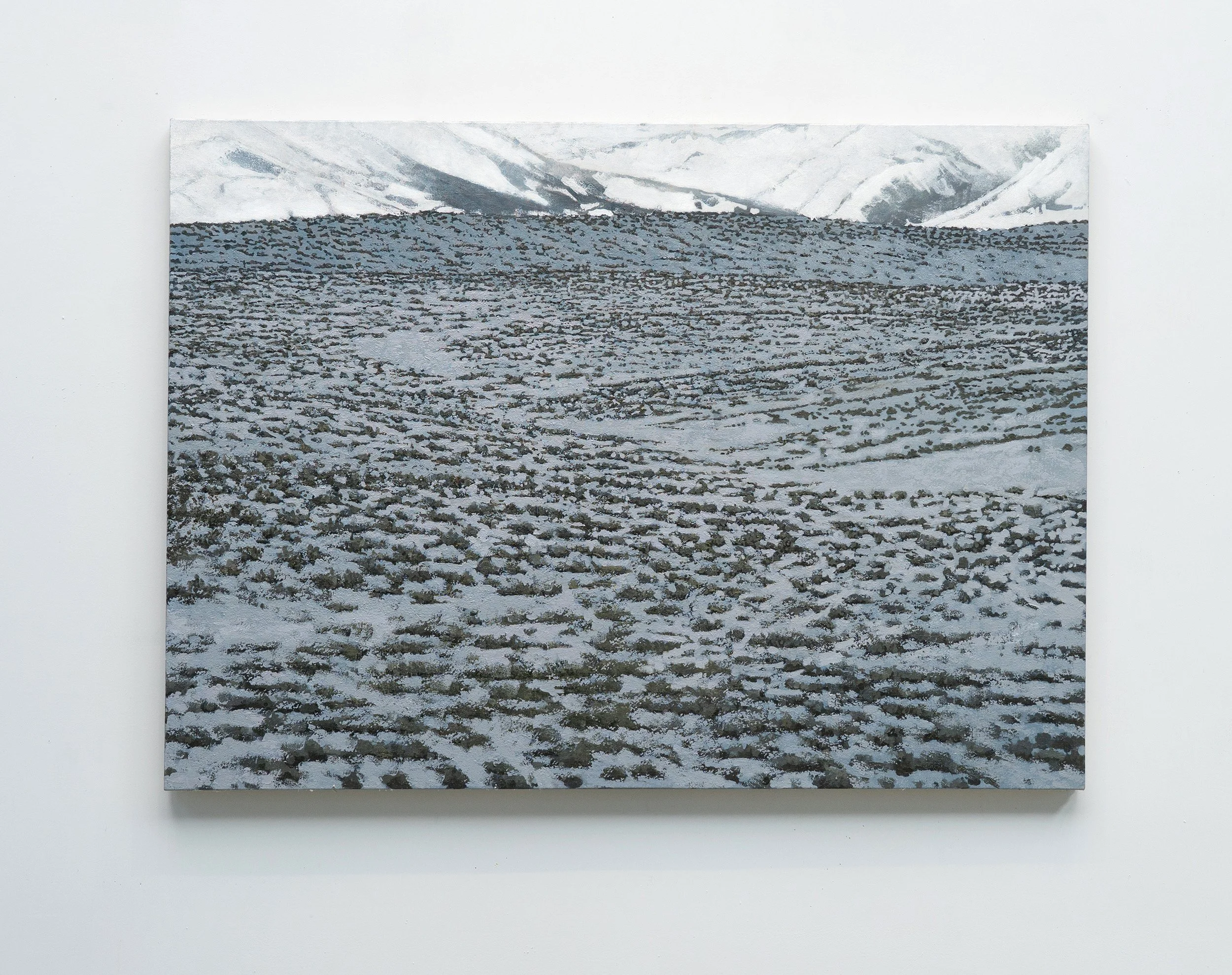 Pfister’s latest flaxseed oil derived paints—his best yet—have taken on a new, more monochromatic palette. Black, brown, and grey predominate revealing the strange beauty of the Wyoming desert landscape.